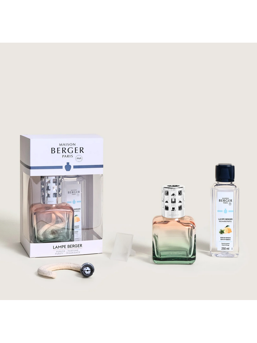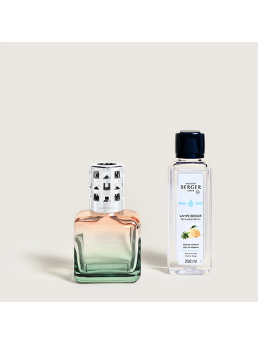 Scoprite l'eleganza della tintura tie-dye color pesca verde e la freschezza della fragranza Verbena Zest in questo raffinato cofanetto regalo Lampe Berger.