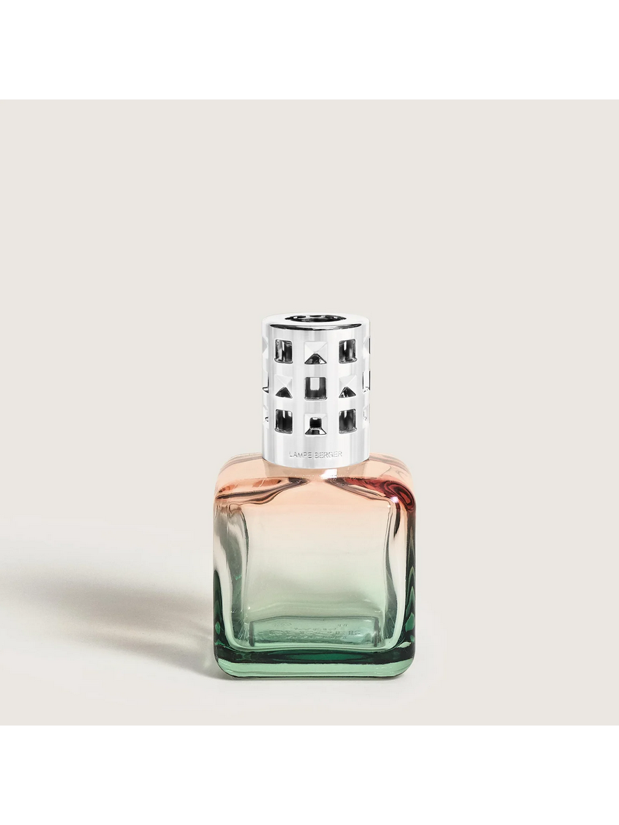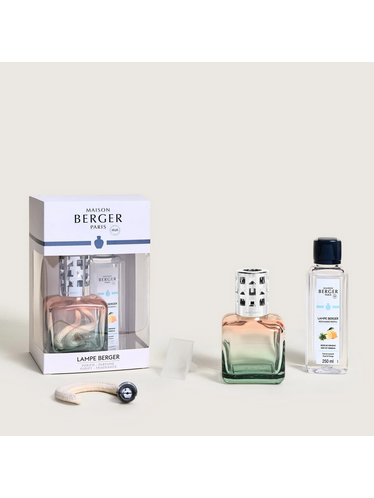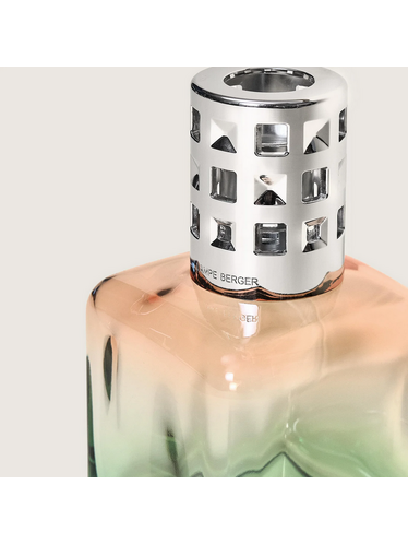 La Lampe Berger Glaçon presenta una finitura tie-dye color pesca-verde, che gioca con le sfumature di luce per amplificarne il fascino decorativo. Questo set, che include una ricarica da 250 ml, è ideale per chi desidera coniugare design contemporaneo e un'atmosfera fresca nella propria casa.