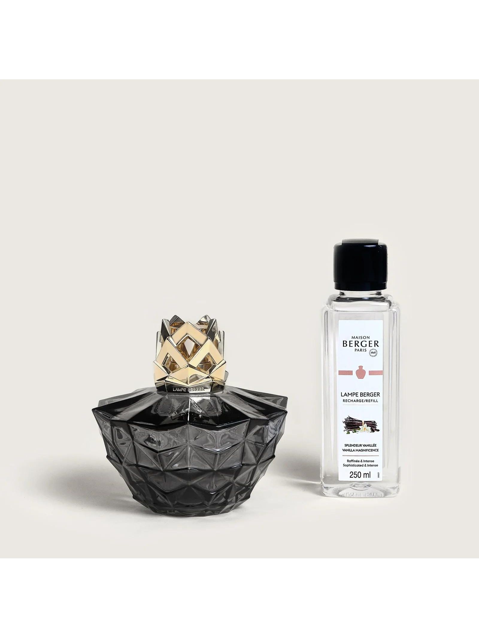 Le superfici scure della lampada Berger sono lavorate in rilievi e volumi scolpiti per catturare la luce. Questa lampada catalitica, ricaricabile con la ricarica di profumo da 250 ml in dotazione, purifica e profuma i tuoi interni, donando un tocco di eleganza al tuo spazio abitativo.