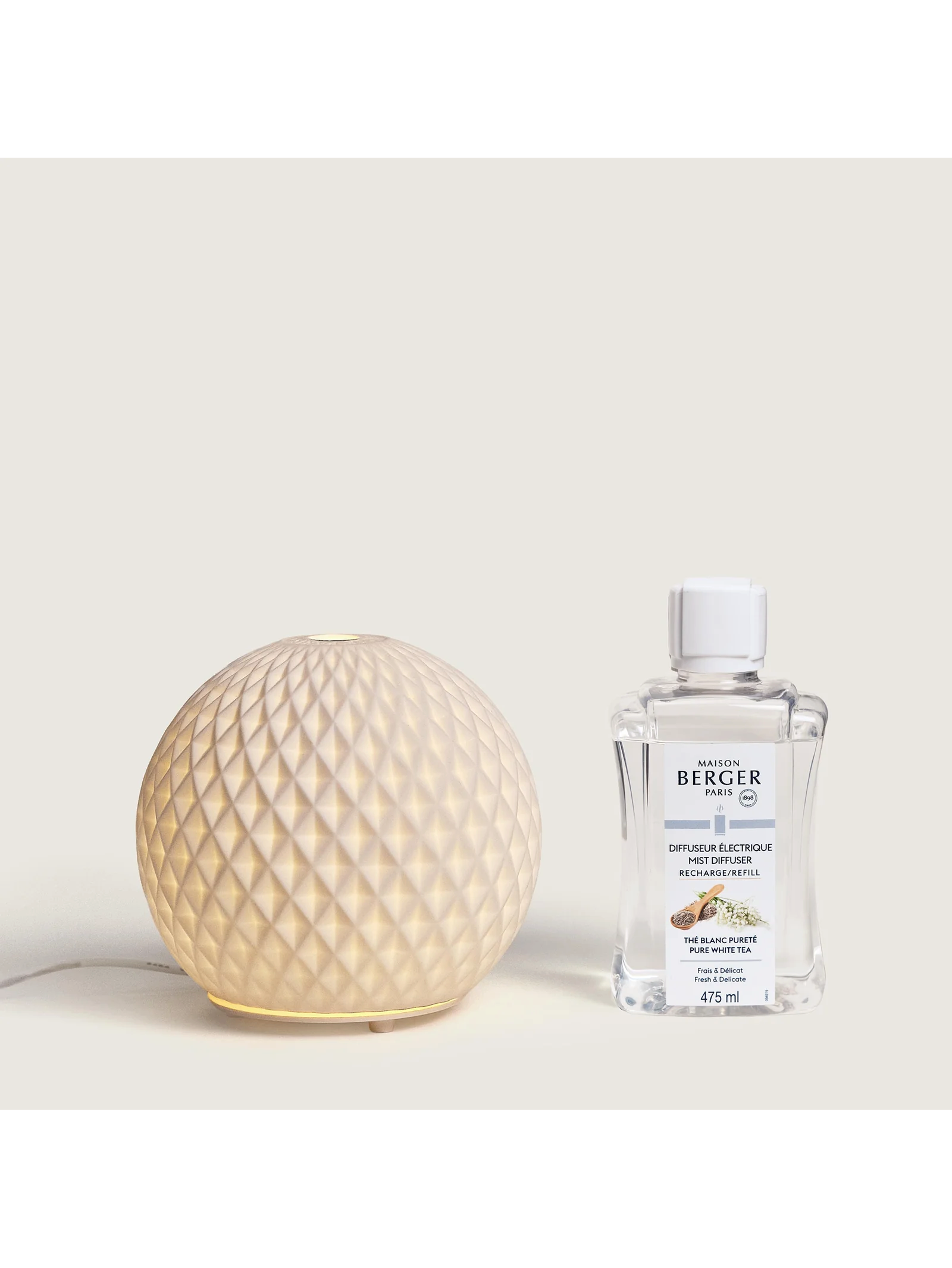 Con il Parfum de Maison Thé Blanc Pureté, Maison Berger Paris ci regala un'interpretazione delicata e raffinata di uno di quei momenti sospesi che la natura può offrirci. Questo è un esercizio di stile, un momento di pura serenità. Alcune note di testa, bergamotto e ribes nero, tanto semplici quanto discrete. Un cuore puro, con il candore del suo tè, immacolato come un delicato bouquet di mughetto, rosa e gelsomino. Poi si posa un velo di muschi bianchi, leggero e avvolgente, sfumato di tocchi di cedro.